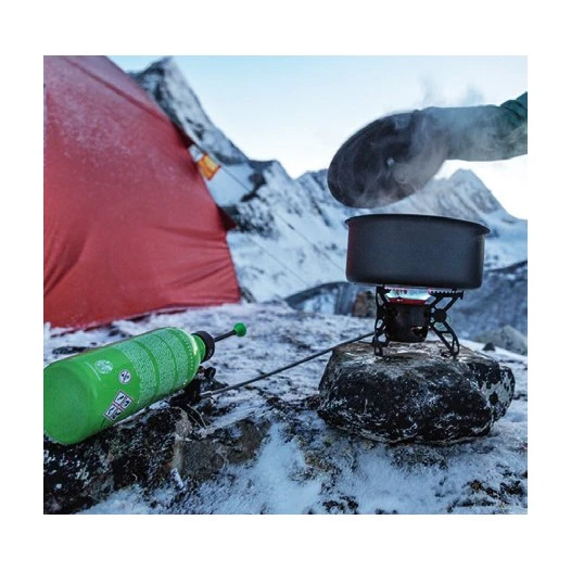 One jet – any fuel: The multitalented stove with its single jet technology delivers excellent cooking performance with LPG Gas, White Gas, Kerosene, Diesel and Jet Fuel without having to change anything on the stove. The integrated Magic™ cleaning needle ensures quick and easy cleaning of the jet – even during cooking. Durable aluminum pump provides for more safety and convenience. The self purging Flipstop™ pump clears the burner of fuel and depressurizes the fuel bottle. The patented quick priming burner requires less preheating and saves fuel. Integrated 4 season mode when operating the stove with gas. For increased heat output – for example in cold conditions and to reduce boil time.