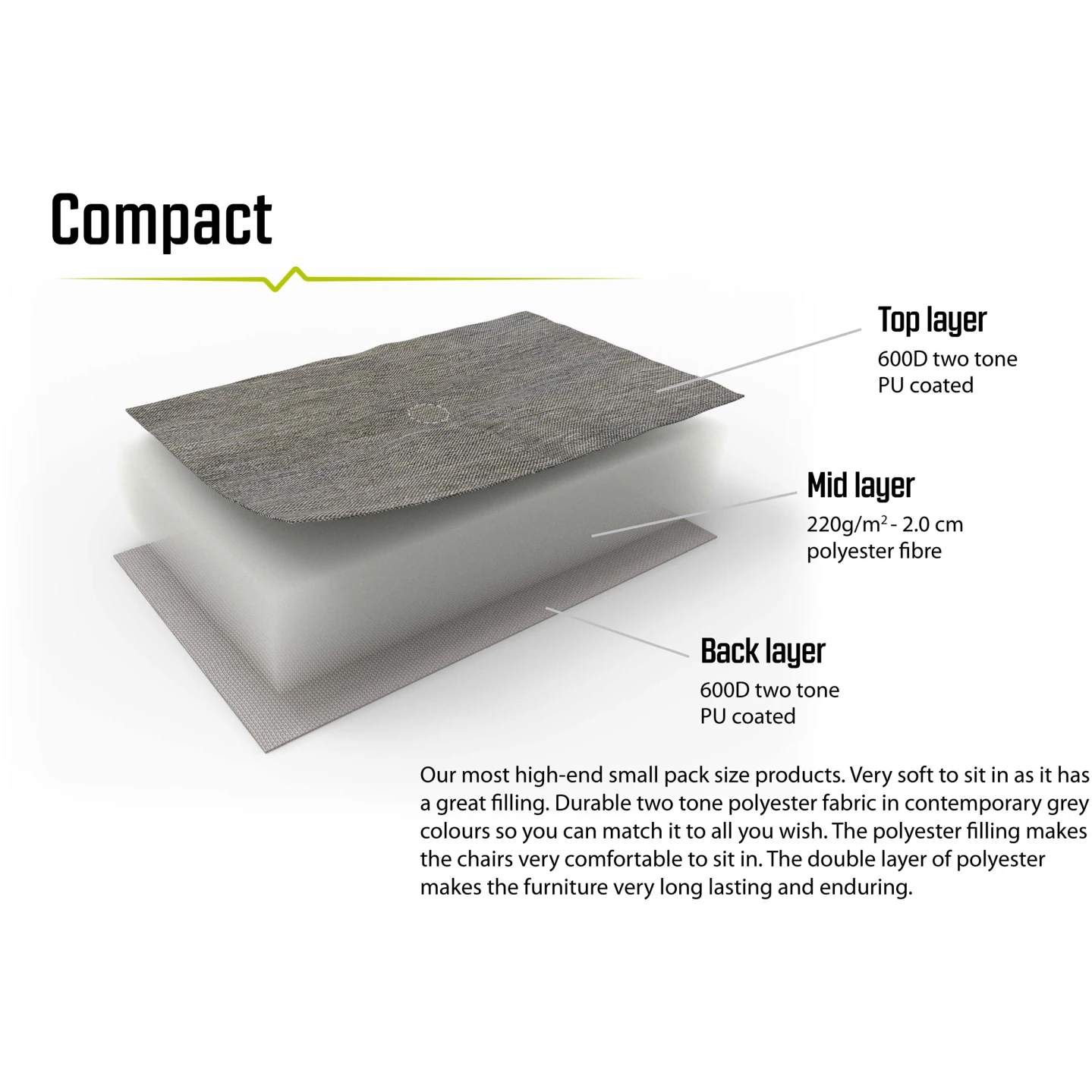 De met hoge rug is niet alleen klein op te bergen, maar biedt dankzij zijn lichte gewicht ook veel kampeercomfort. U kunt ontspannen op de gezellige, zacht gewatteerde stof die u comfortabel houdt op kille avonden. U zult ook genieten van het gewatteerde nekkussen wanneer u achterover leunt en u uitrekt na de avonturen van de dag.