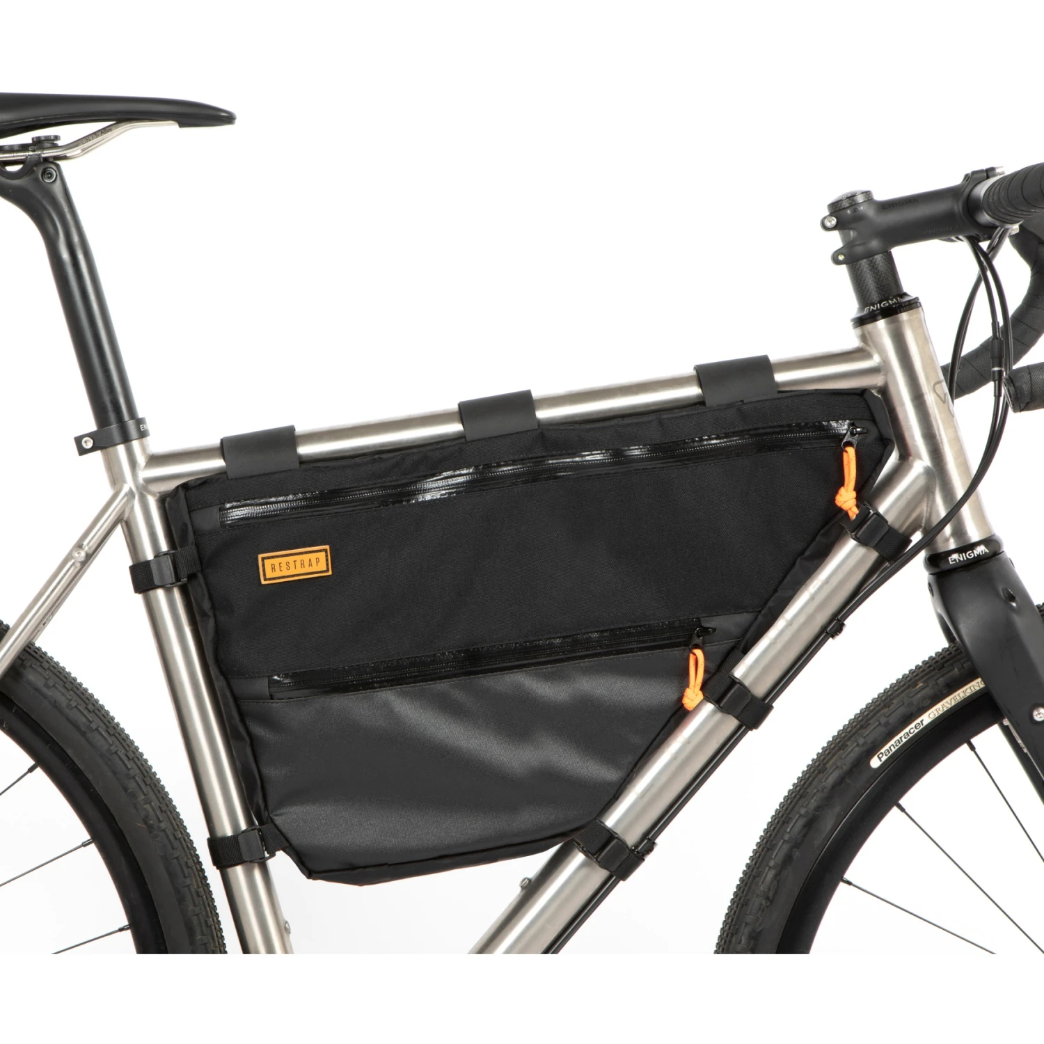 De tas is gemaakt van duurzaam nylon met textuur en VX21-stof. Het onderste deel is afwasbaar, zodat de tas gemakkelijk schoon te houden is, zelfs bij off-road rijden of slecht weer. De rubberen riemen bieden extra grip op het frame en de banden met eenvoudig te gebruiken cam-lock gespen zorgen ervoor dat de tas stevig zit en niet verschuift tijdens het rijden. Alle tassen zijn handgemaakt in de werkplaats van het bedrijf in Yorkshire en zijn voorzien van het klassieke Restrap-label, dat is gemaakt van veganistisch, milieuvriendelijk PU.